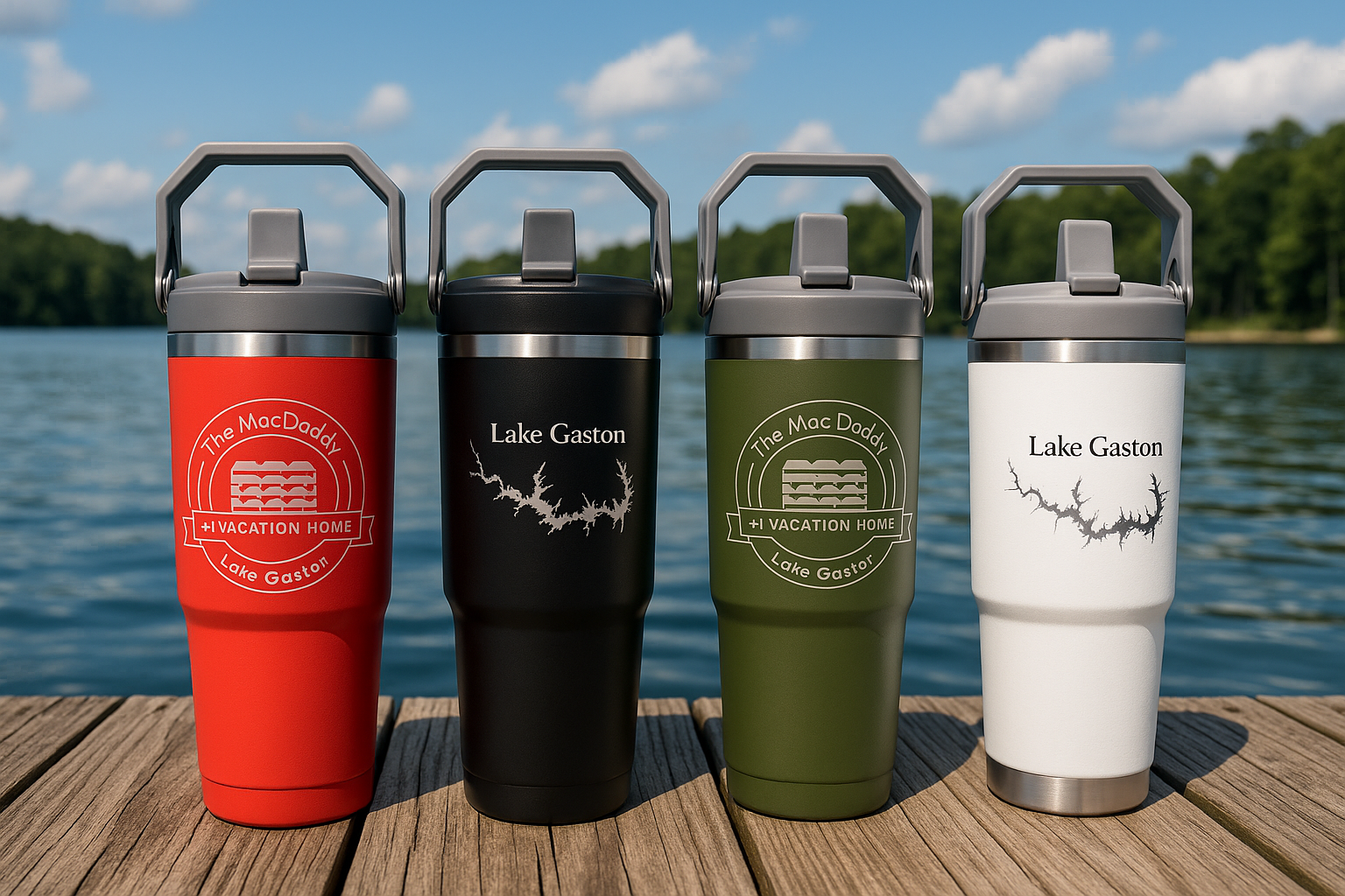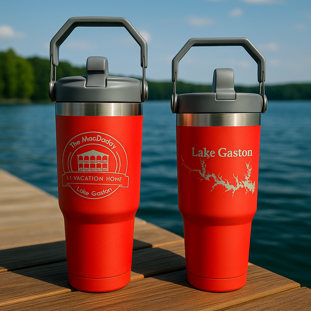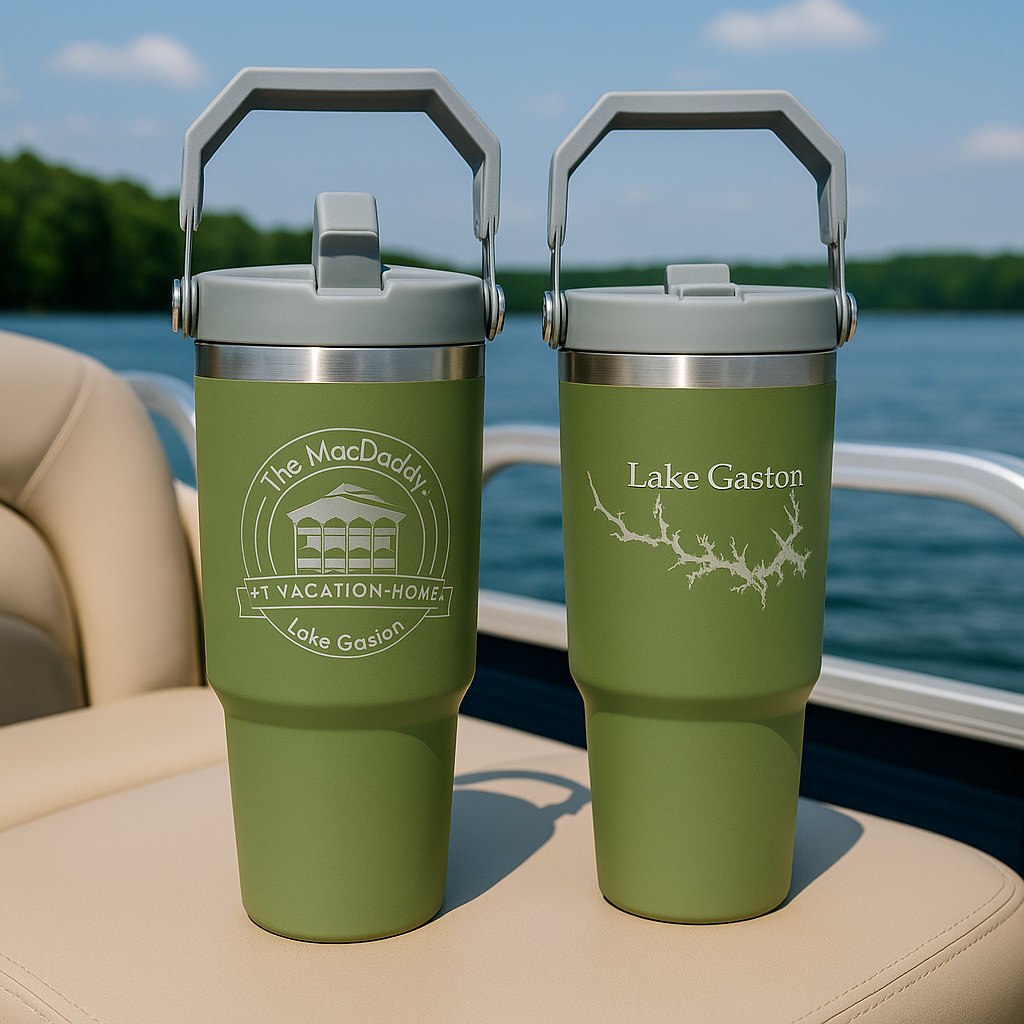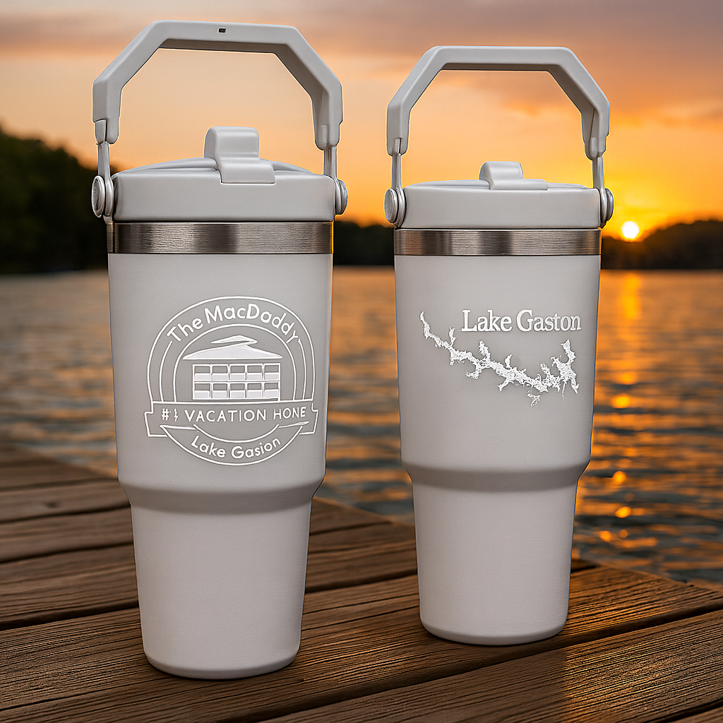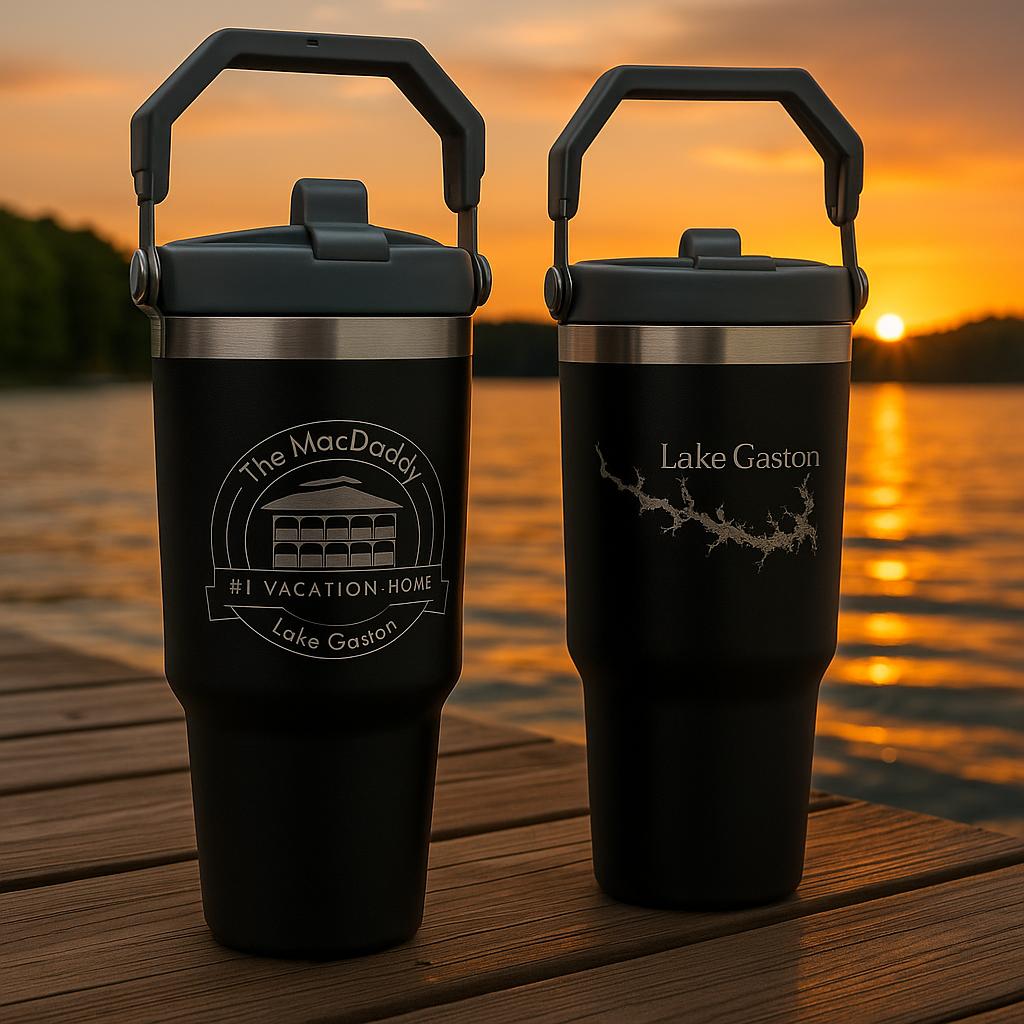 The ultimate Lake Gaston sidekick. These big 30oz tumblers are BPA-free, double-wall insulated, and built to keep your drink cold all day long. Each one features two logos — the MacDaddy badge on one side and the Lake Gaston map on the other.